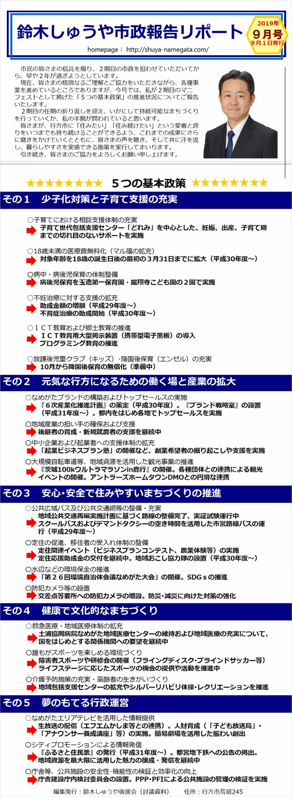 鈴木しゅうやが2期目のマニフェストとして掲げた「5つの基本政策」推進状況についてご報告いたします(2019年9月時点)。